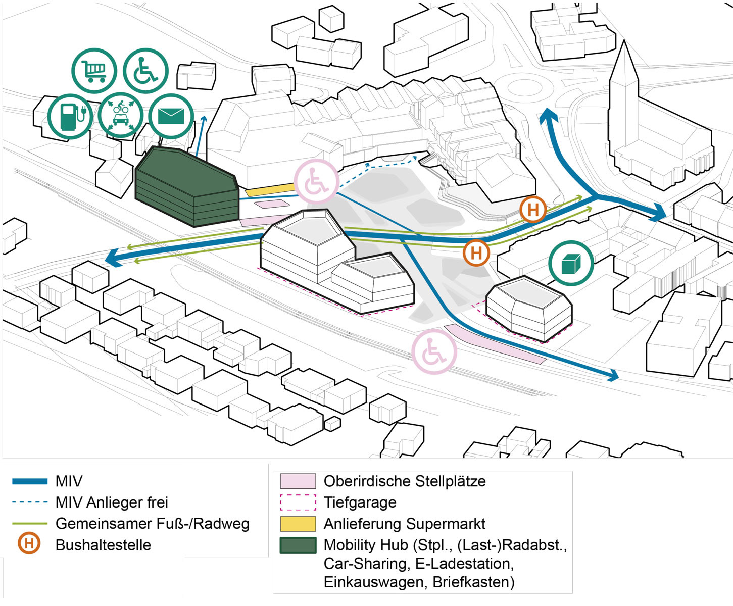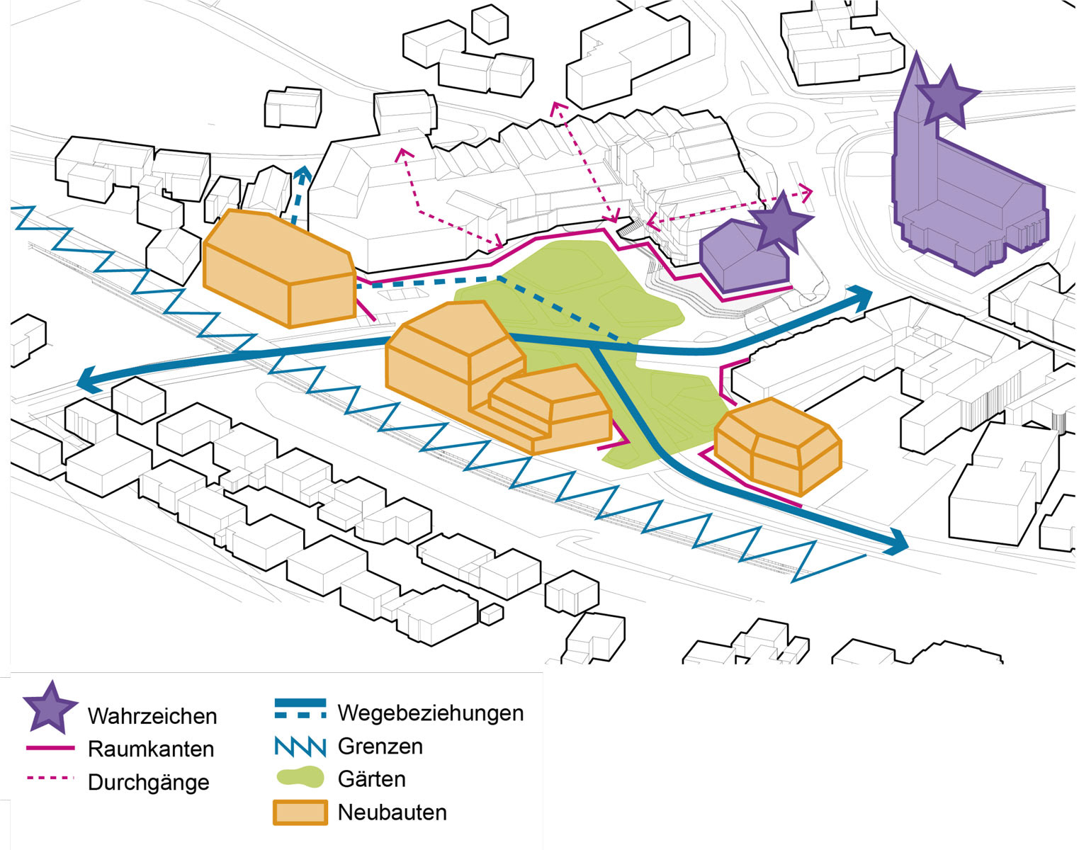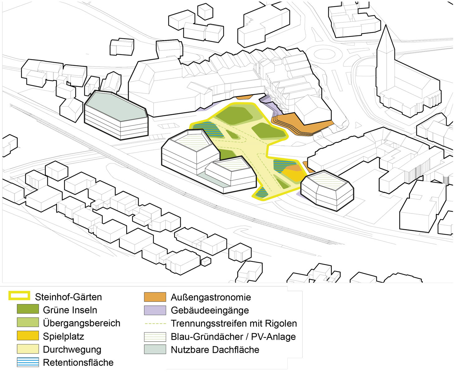 Das Siegerkonzept sieht einen zentralen, einheitlich gestalteten Freiraum vor, der von Bestands- und Neubauten umschlossen wird. Zur planerischen Umsetzung dieses Entwurfs ist die Erstellung eines Bebauungsplans erforderlich, der im Geltungsbereich die aktuellen Bebauungspläne in den überlagerten Bereichen überplant. Das Verfahren wird im beschleunigten Verfahren nach § 13a BauGB durchgeführt.